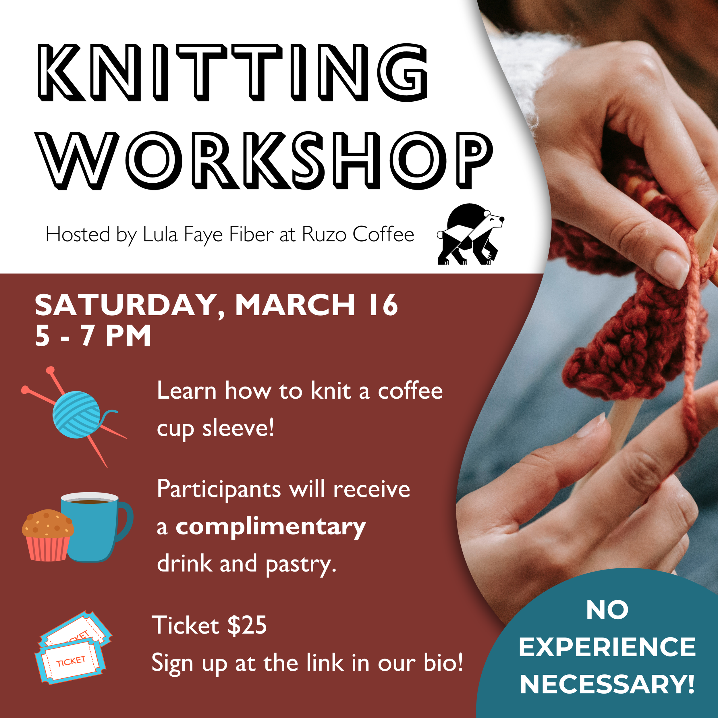 Beginning Knitting Class at Ruzo! Saturday, March 16, 2024 5:00 PM 7:00 PM Google Calendar ICS Register HERE!